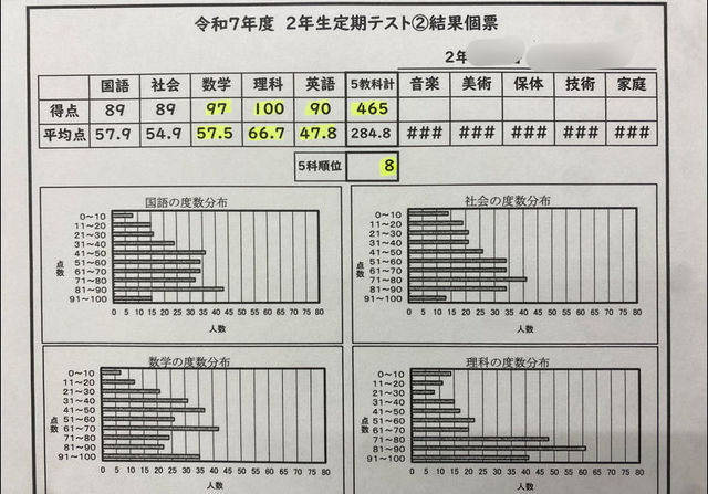 学年8位おめでとう!(とある学年260人くらいのマンモス中の2年生男子です)