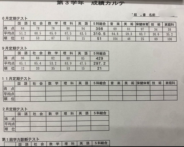 前回、つまり1学期の期末テストは『学年51位』、西尾中学校はレベルが高いので、この順位でも相当すごいのですが、そこからさらに、『この時期にこれだけ順位を上げたこと』、これがすごいですね。