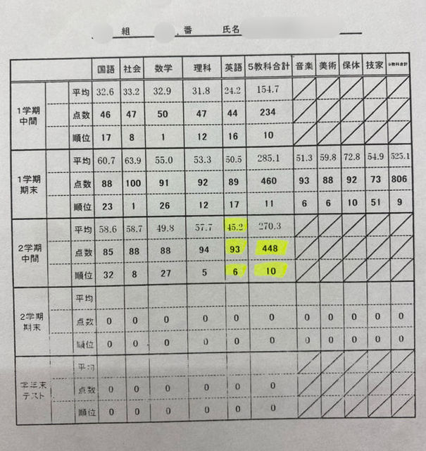 特に今回、各中学校の英語の難易度が爆上がりしていたようで、こちらの中学校でも平均点が『45.2』と激辛ぶりが伺えますが、そんな逆風をものともせず『93点で学年6位』でした!