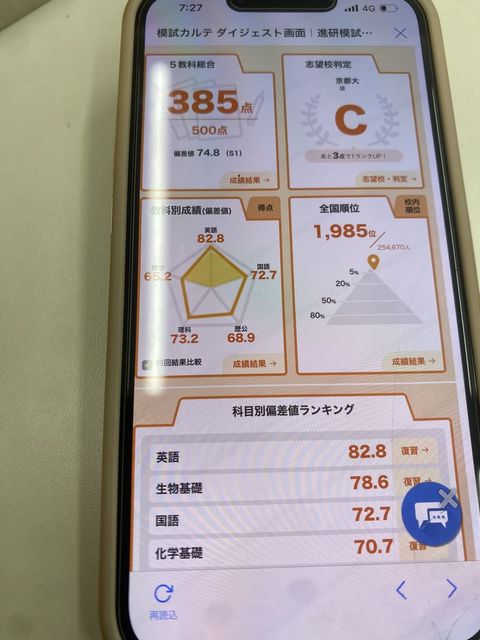 しかしこの点数、偏差値でもさすがに天下の京都大学、志望校判定はCと出ていますが・・・。