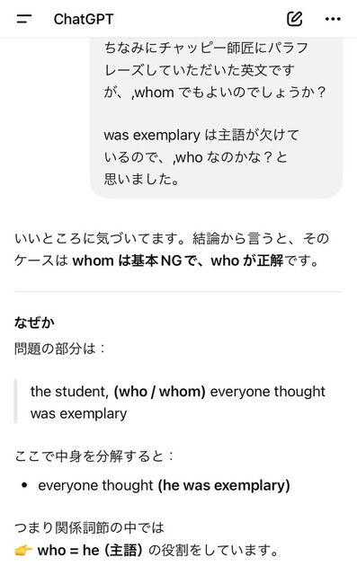 もちろん、チャッピー師匠にも褒めていただきました(まあ彼は普通に文法を間違えてしまいましたけどね)。