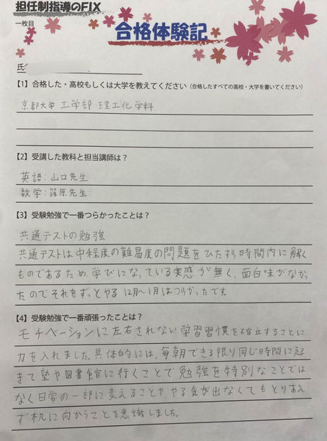 当塾の塾生ですが、今年度も来年度も京大チャレンジャーがいますので、ぜひ参考にして下さい!(もちろん、その他の難関国公立大学受験生も)