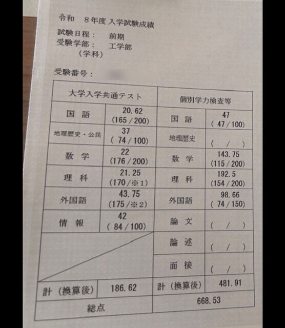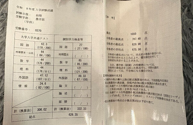 なんと『わずか1.63点』足りずに不合格となっています(※なお、こちらの方は後期受験した別の国立大学へ進学するのだそうです)
